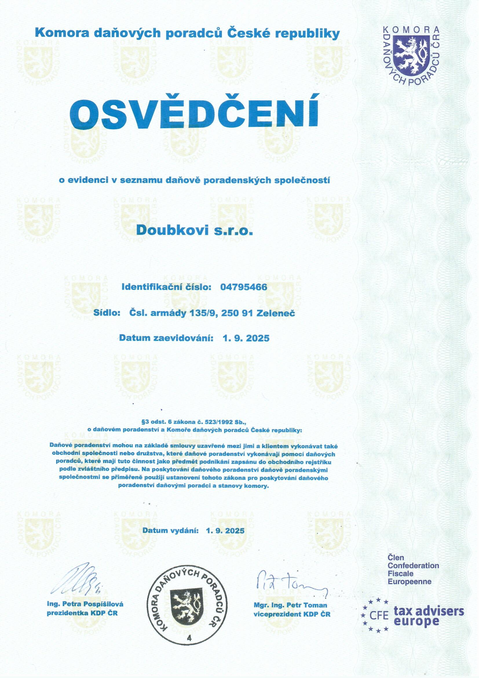 daňově poradenská společnost (osvědčení)